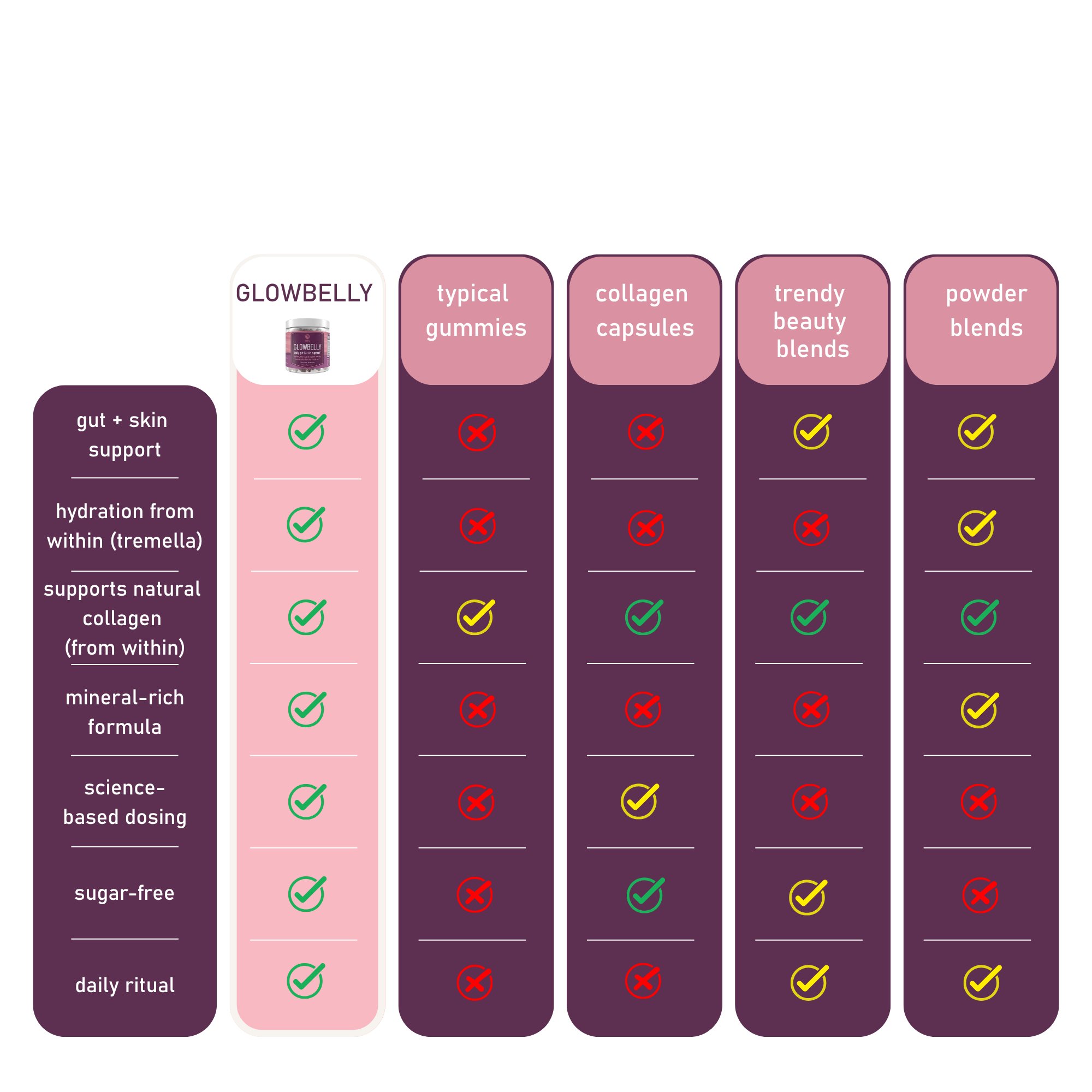 Glowbelly is your daily gut and skin support, formulated to support gut balance, collagen production, hydration, and healthy skin from within — so you can glow with confidence, naturally.
